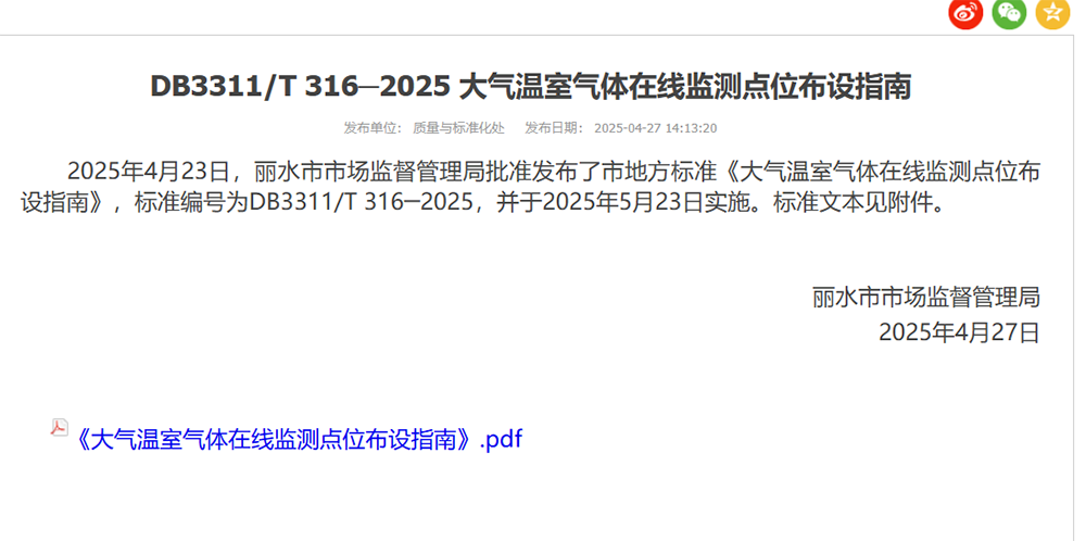 省环保集团牵头起草的丽水市地方标准《大气温室气体在线监测点位布设指南》正式实施
